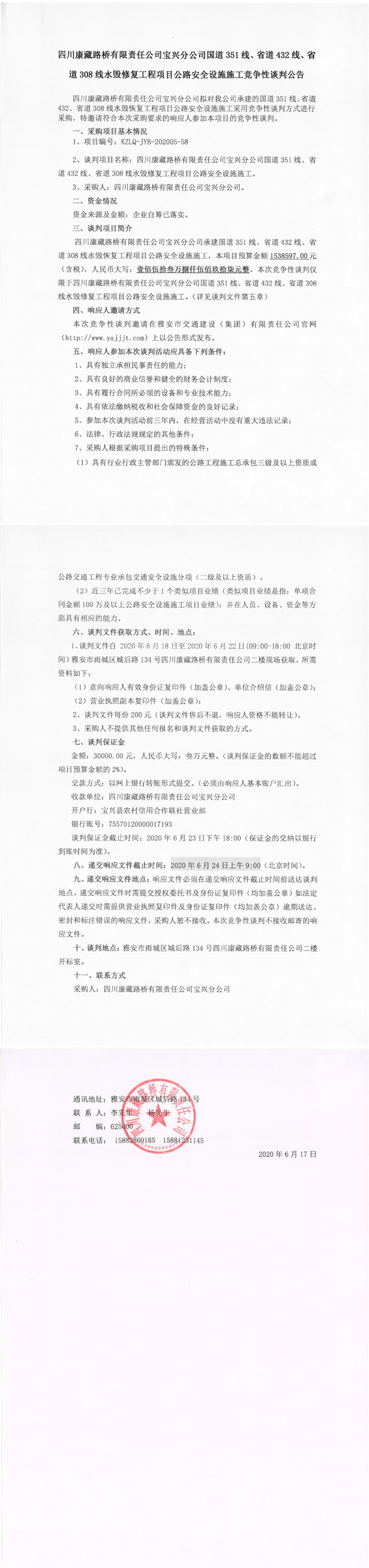 四川康藏路橋有限責任公司寶興分公司國道351線、省道432線、省道308線水毀修復工程項目公路安全設(shè)施施工競爭性談判公告