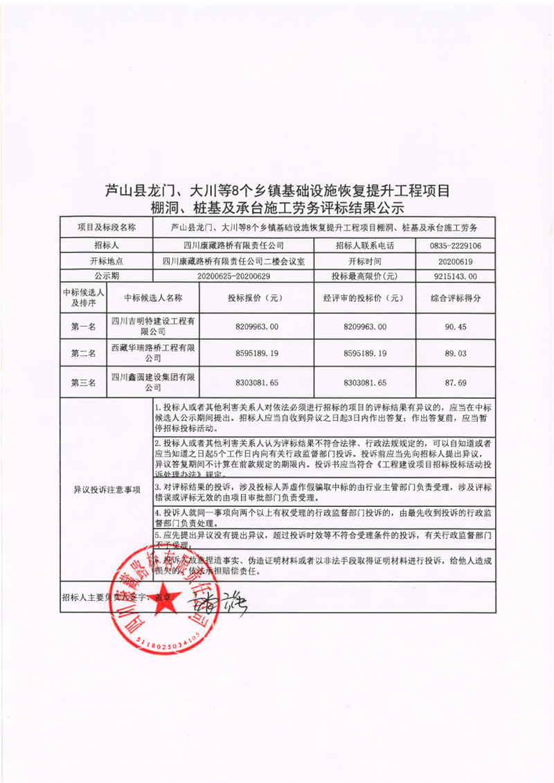 四川康藏路橋有限責(zé)任公司蘆山縣龍門、大川等8個(gè)鄉(xiāng)鎮(zhèn)基礎(chǔ)設(shè)施恢復(fù)提升工程項(xiàng)目棚洞、樁基及承臺(tái)施工勞務(wù)評(píng)標(biāo)結(jié)果公示