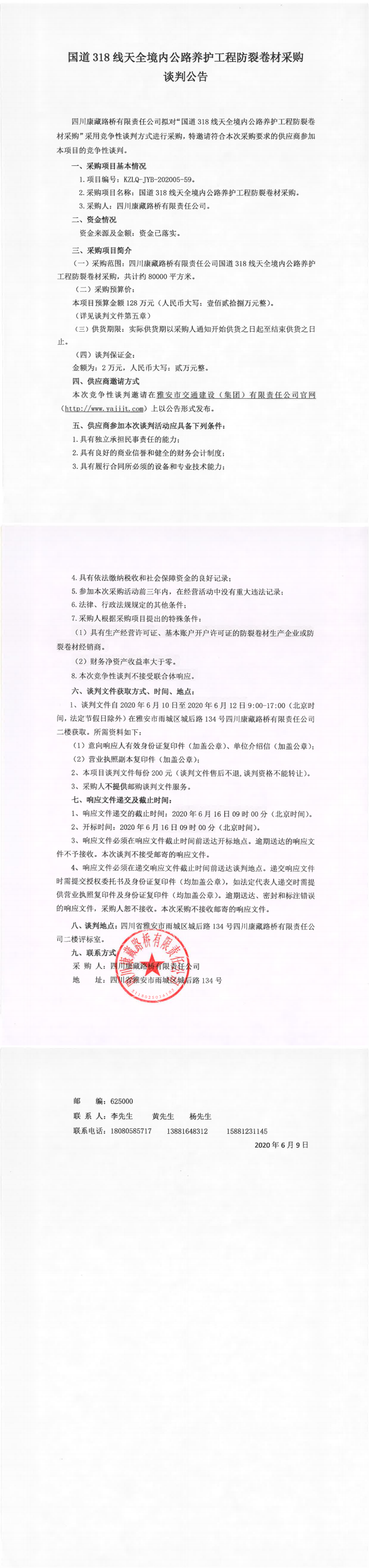 四川康藏路橋有限責任公司國道318線天全境內公路養(yǎng)護工程防裂卷材采購競爭性談判公告