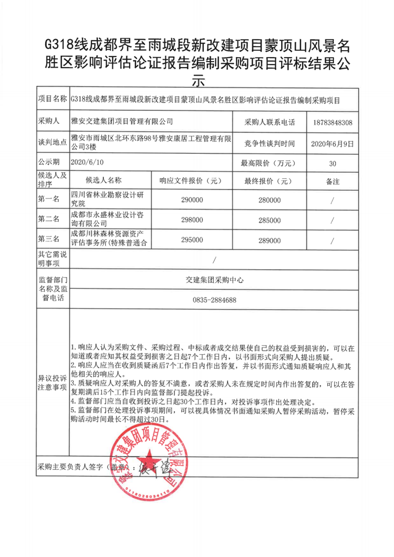 雅安交建集團(tuán)項(xiàng)目管理有限公司G318線成都界至雨城段新改建項(xiàng)目蒙頂山風(fēng)景名勝區(qū)影響評(píng)估論證報(bào)告編制采購項(xiàng)目評(píng)標(biāo)結(jié)果公示
