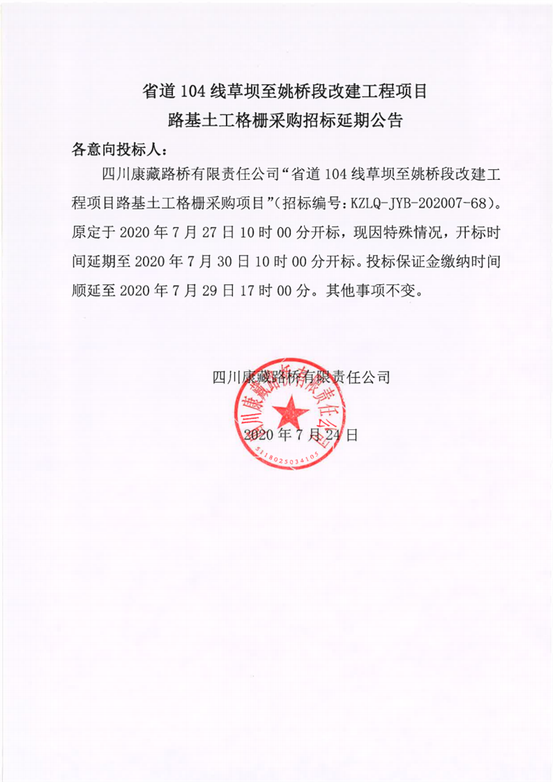 四川康藏路橋有限責(zé)任公司省道104線草壩至姚橋段改建工程項(xiàng)目路基土工格柵采購(gòu)招標(biāo)延期公告