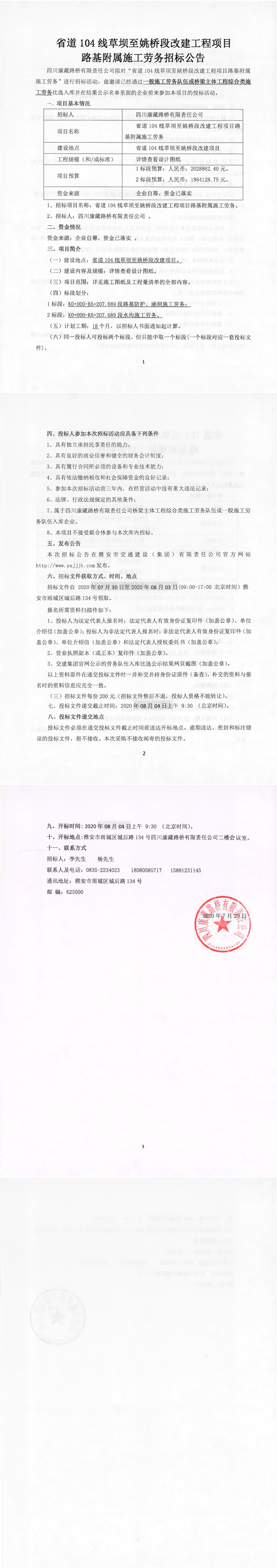 四川康藏路橋有限責任公司省道104線草壩至姚橋段改建工程項目路基附屬施工勞務招標公告