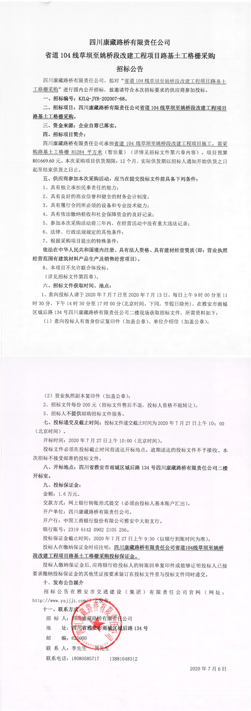 四川康藏路橋有限責(zé)任公司省道104線草壩至姚橋段改建工程項(xiàng)目路基土工格柵采購(gòu)招標(biāo)公告