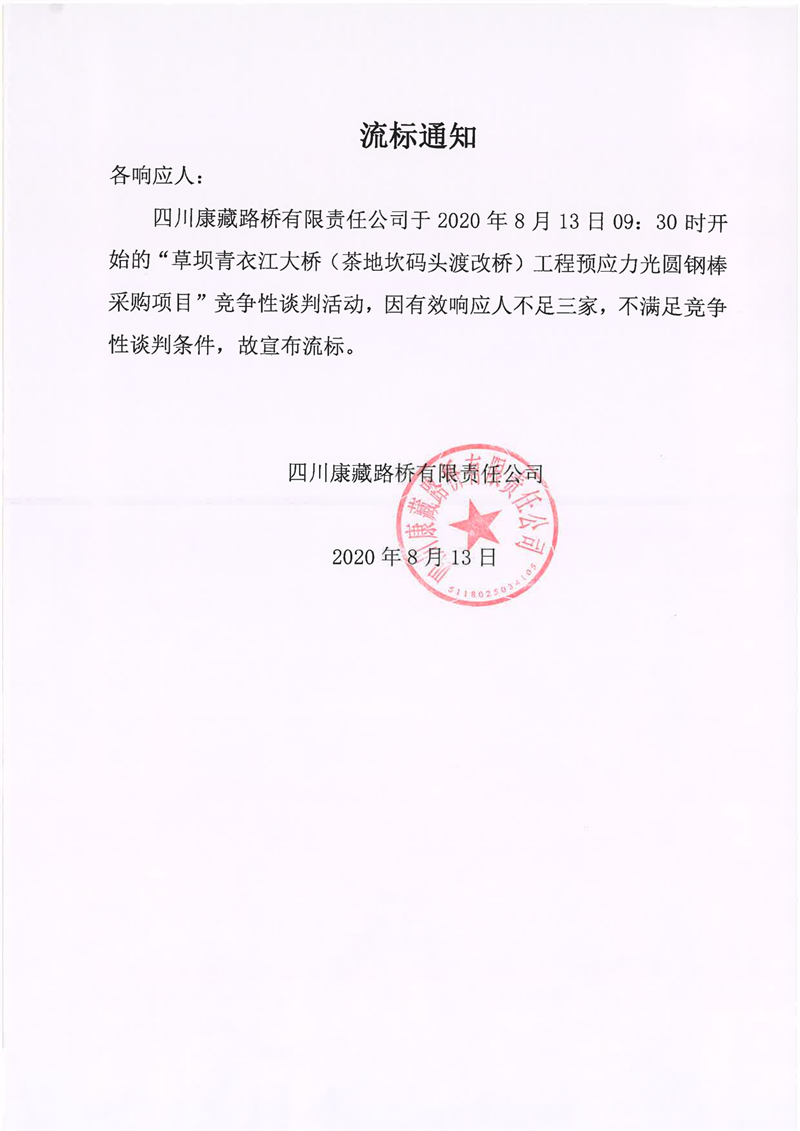 四川康藏路橋有限責(zé)任公司草壩青衣江大橋(茶地坎碼頭渡改橋)工程預(yù)應(yīng)力光圓鋼棒采購項目流標通知