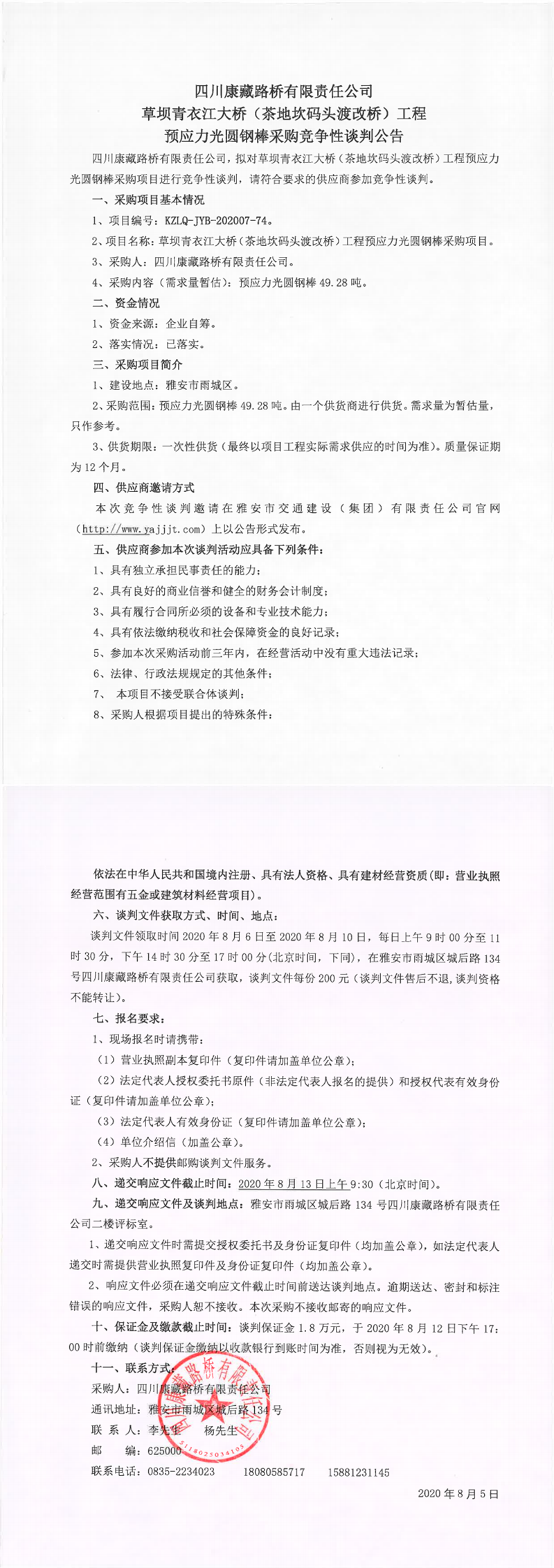 四川康藏路橋有限責(zé)任公司草壩青衣江大橋(茶地坎碼頭渡改橋)工程預(yù)應(yīng)力光圓鋼棒采購競爭性談判公告