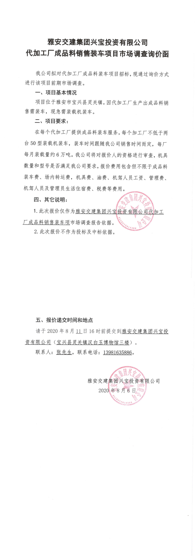 雅安交建集團興寶投資有限公司代加工成品料銷售裝車項目市場調查詢價函