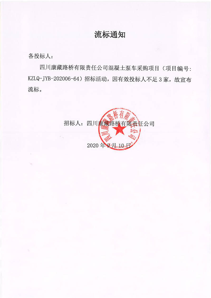 四川康藏路橋有限責(zé)任公司混凝土泵車采購項目流標通知
