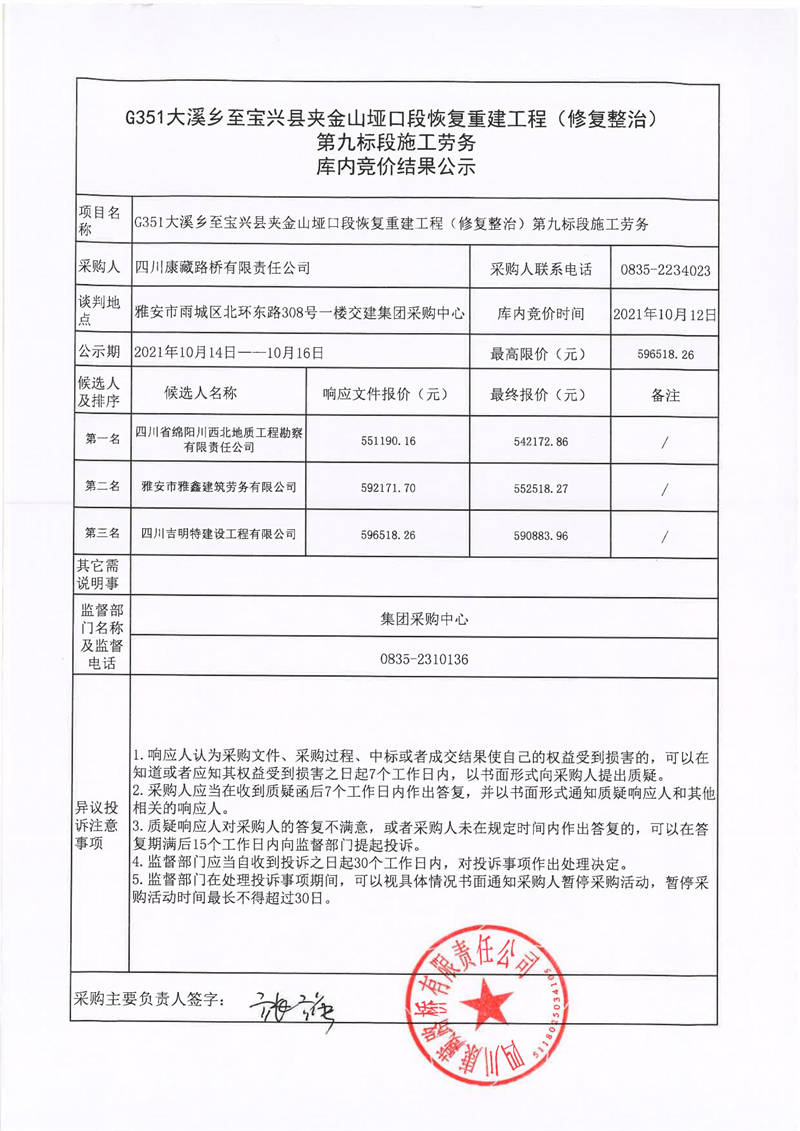 四川康藏路橋有限責(zé)任公司G351大溪鄉(xiāng)至寶興縣夾金山埡口段恢復(fù)重建工程(修復(fù)整治)第九標(biāo)段施工勞務(wù)庫(kù)內(nèi)競(jìng)價(jià)結(jié)果公示