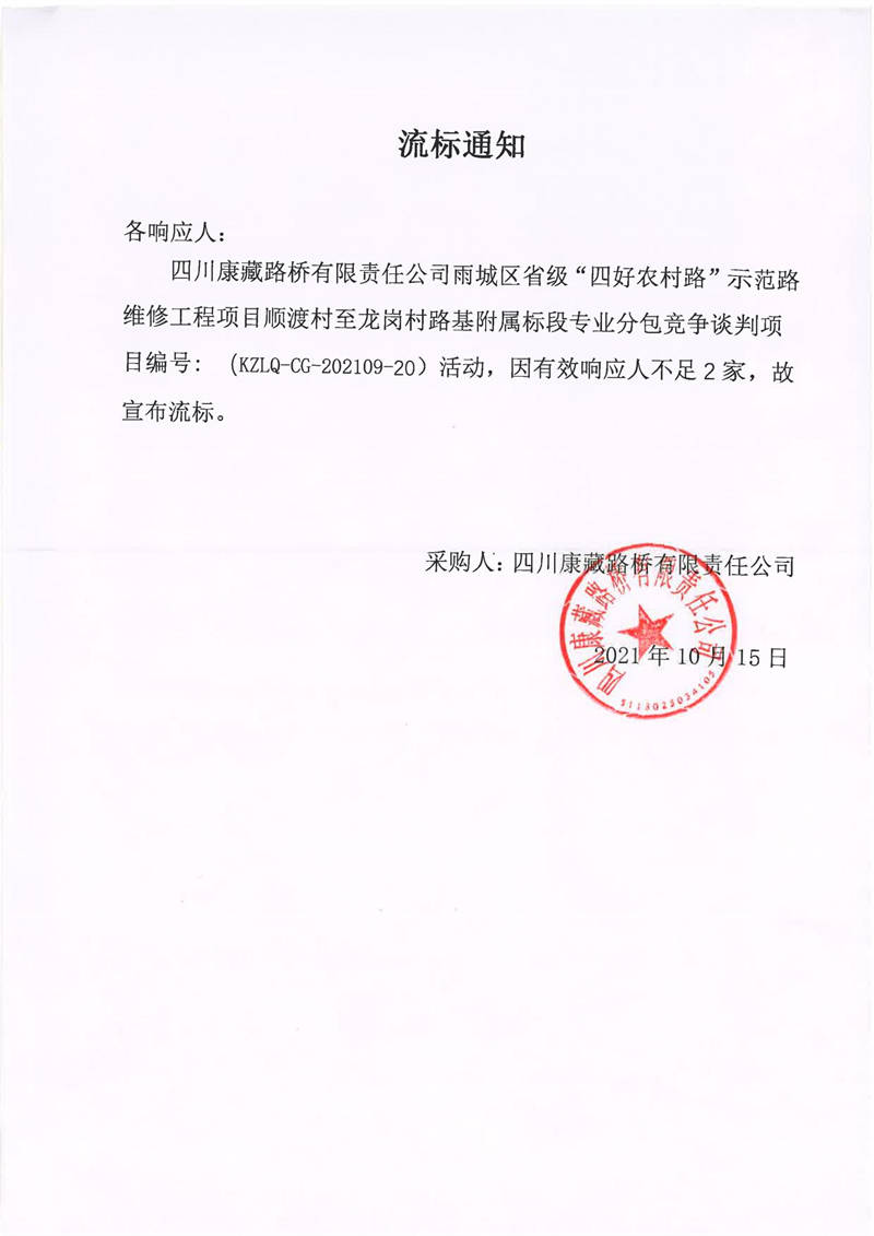 四川康藏路橋有限責任公司雨城區(qū)省級“四好農(nóng)村路”示范路維修工程項目順渡村至龍崗村路基附屬標段專業(yè)分包流標通知