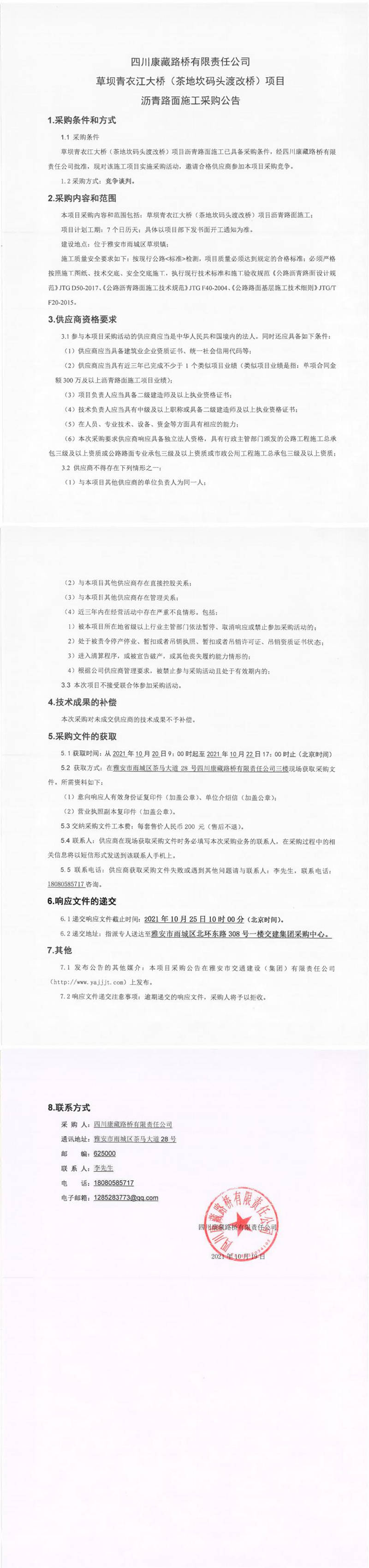 四川康藏路橋有限責(zé)任公司草壩青衣江大橋(茶地坎碼頭渡改橋)項(xiàng)目瀝青路面施工采購公告