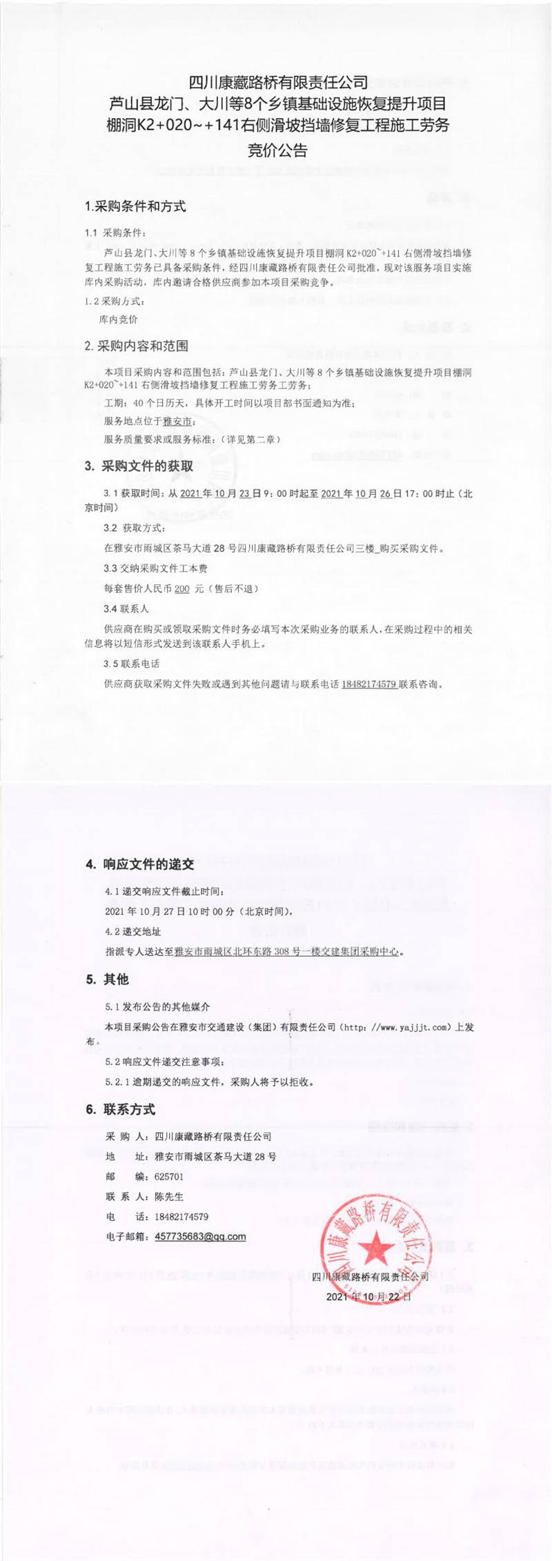 四川康藏路橋有限責(zé)任公司蘆山縣龍門、大川等8個(gè)鄉(xiāng)鎮(zhèn)基礎(chǔ)設(shè)施恢復(fù)提升項(xiàng)目棚洞K2+020~+141右側(cè)滑坡?lián)鯄π迯?fù)工程施工勞務(wù)采購競(jìng)價(jià)公告