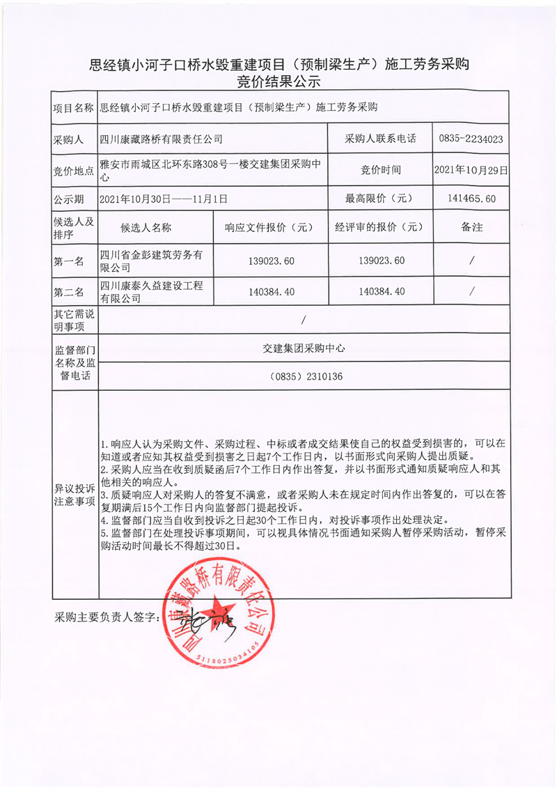 四川康藏路橋有限責(zé)任公司思經(jīng)鎮(zhèn)小河子口橋水毀重建項(xiàng)目(預(yù)制梁生產(chǎn))施工勞務(wù)采購(gòu)競(jìng)價(jià)結(jié)果公示