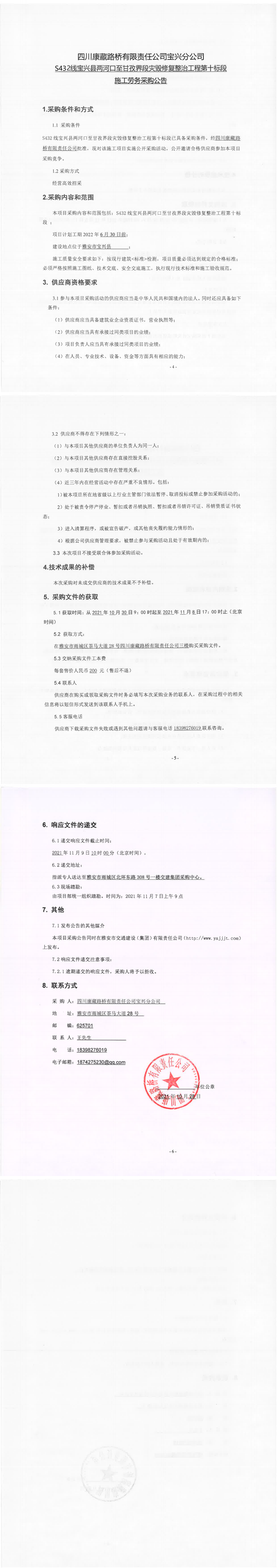 四川康藏路橋有限責(zé)任公司寶興分公司S432線寶興縣兩河口至甘孜界段災(zāi)毀修復(fù)整治工程第十標(biāo)段施工勞務(wù)采購(gòu)公告