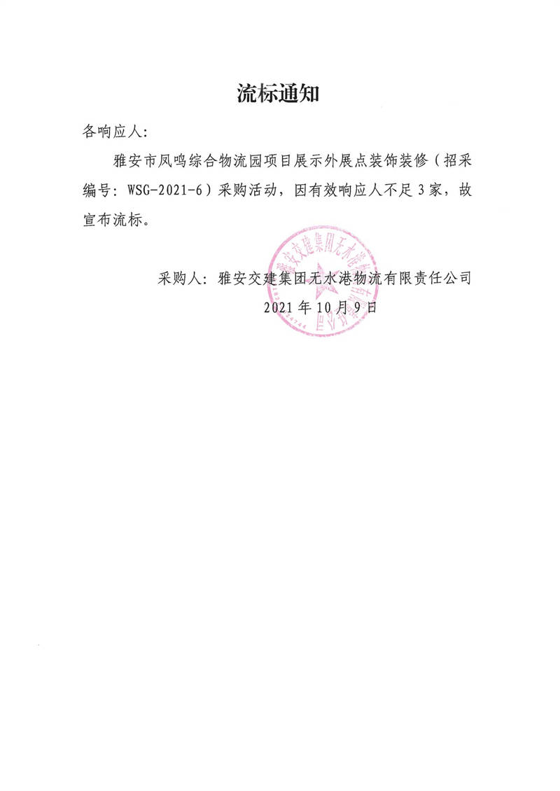 雅安交建集團無水港物流有限責(zé)任公司雅安市鳳鳴綜合物流園項目展示外展點裝飾裝修流標通知