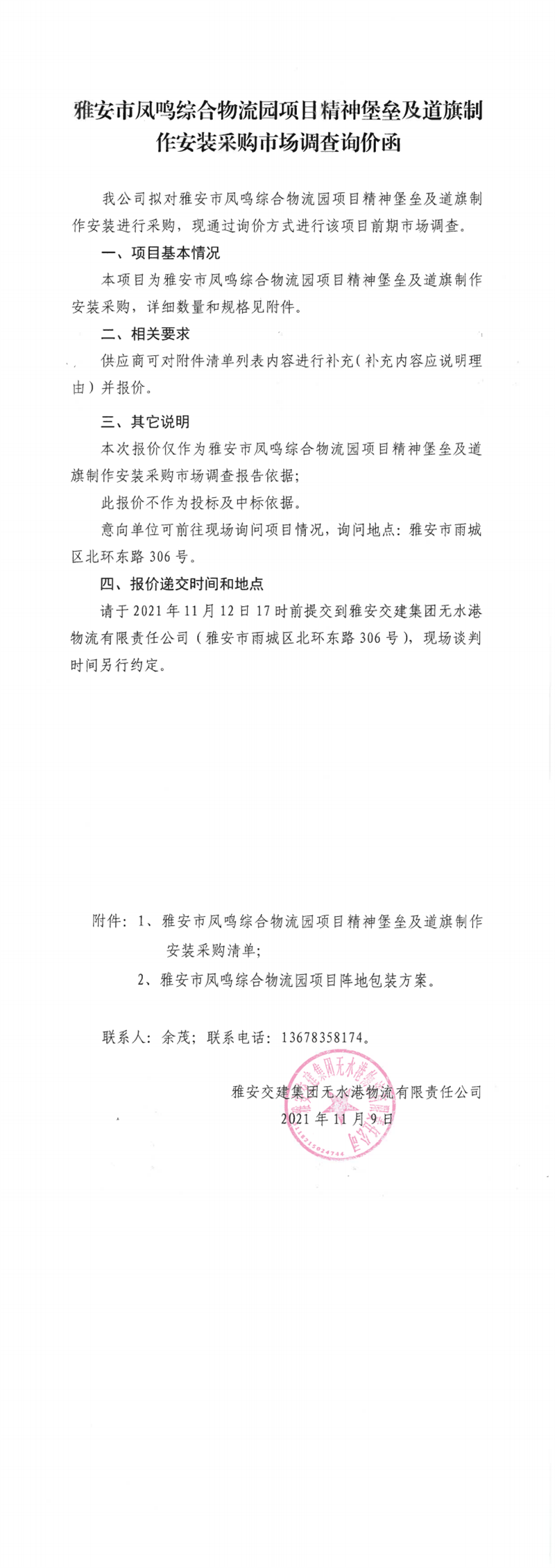 雅安交建集團無水港物流有限責任公司雅安市鳳鳴綜合物流園項目精神堡壘及道旗制作安裝采購市場調(diào)查詢價函