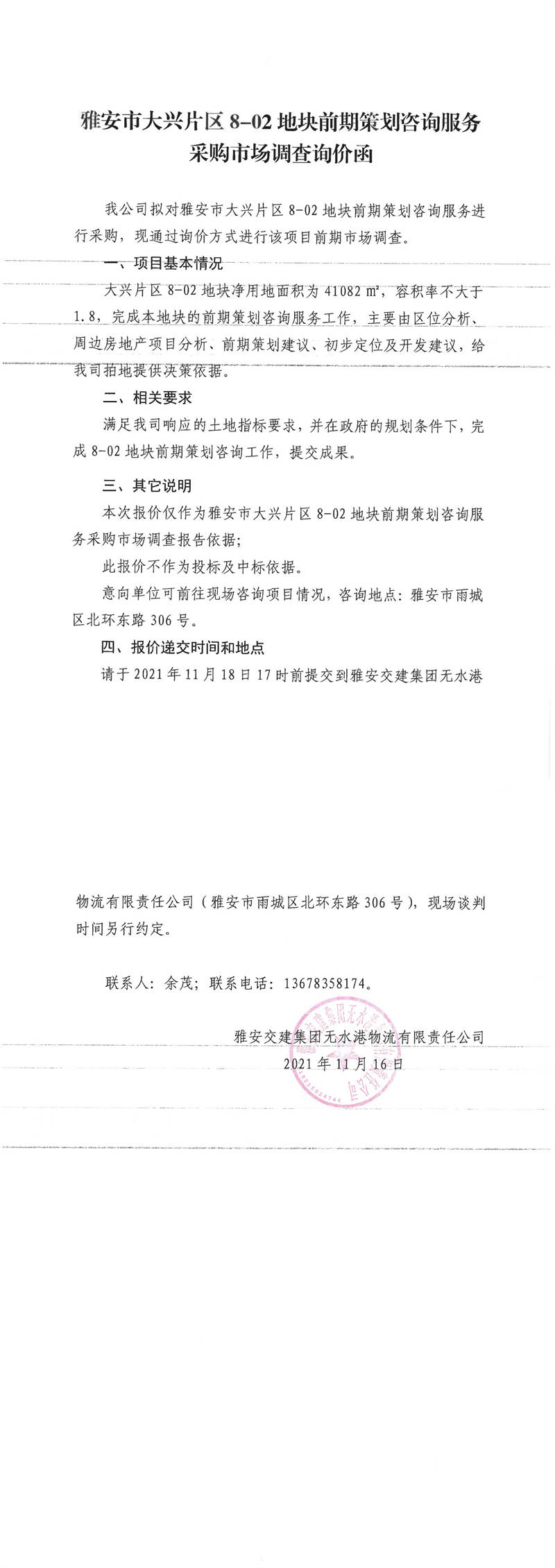 雅安交建集團無水港物流有限責任公司雅安市大興片區(qū)8-02地塊前期策劃咨詢服務采購市場調(diào)查詢價函