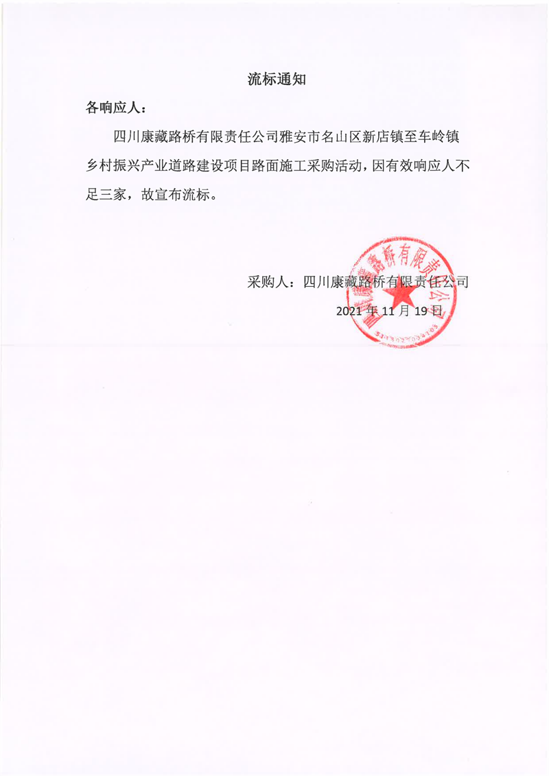 四川康藏路橋有限責任公司雅安市名山區(qū)新店鎮(zhèn)至車嶺鎮(zhèn)鄉(xiāng)村振興產(chǎn)業(yè)道路建設(shè)項目路面施工采購流標通知