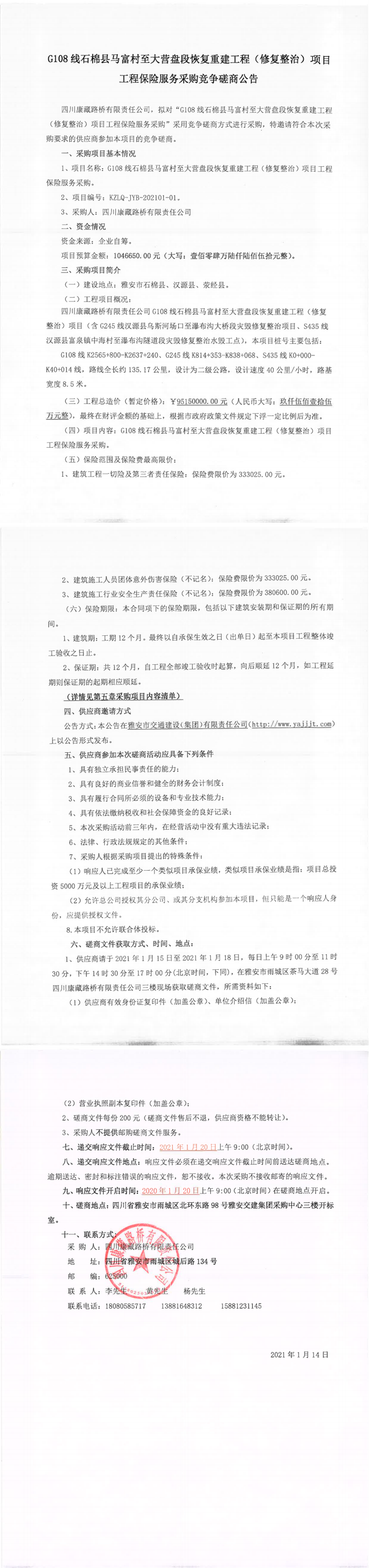四川康藏路橋有限公司G108線石棉縣馬富村至大營盤段恢復(fù)重建工程(修復(fù)整治)項(xiàng)目工程保險(xiǎn)服務(wù)采購競爭磋商公告