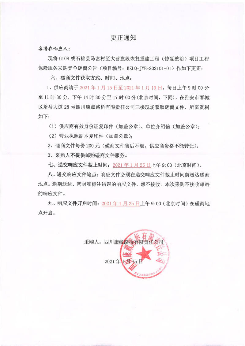 四川康藏路橋有限責(zé)任公司G108線(xiàn)石棉縣馬富村至大營(yíng)盤(pán)段恢復(fù)重建工程(修復(fù)整治)項(xiàng)目工程保險(xiǎn)服務(wù)采購(gòu)更正通知