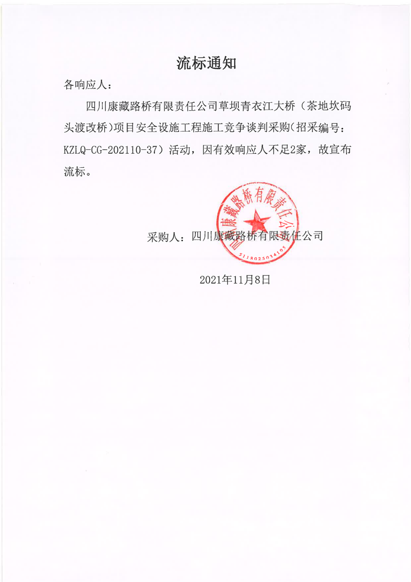 四川康藏路橋有限責(zé)任公司草壩青衣江大橋(茶地坎碼頭渡改橋)項目安全設(shè)施工程施工流標(biāo)通知
