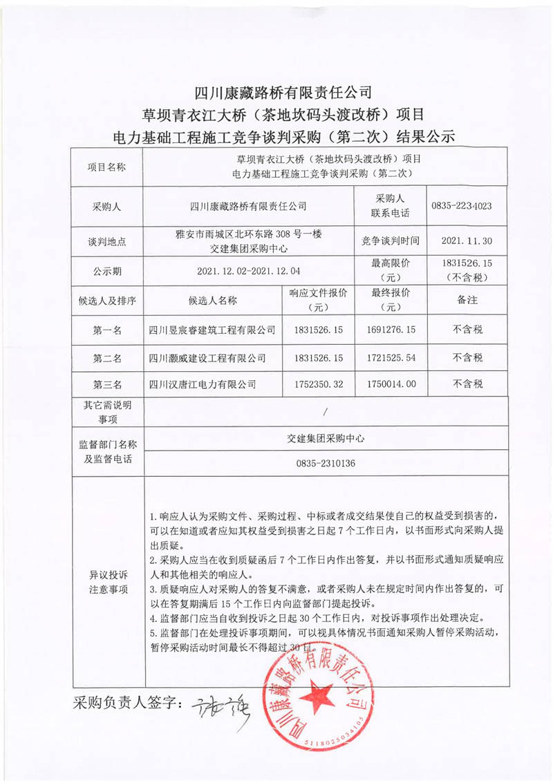 四川康藏路橋有限責(zé)任公司草壩青衣江大橋(茶地坎碼頭渡改橋)項(xiàng)目電力基礎(chǔ)工程施工競(jìng)爭(zhēng)談判采購(第二次)結(jié)果公示