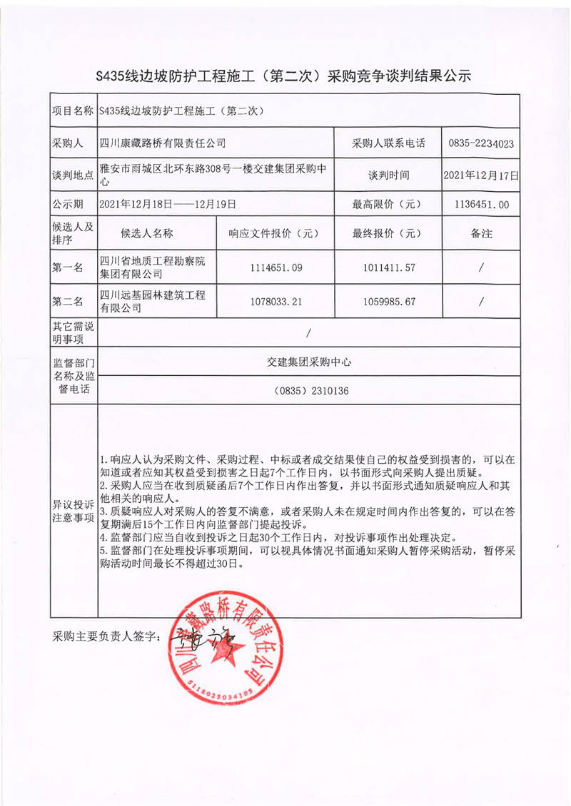 四川康藏路橋有限責(zé)任公司S435線邊坡防護工程施工(第二次)采購競爭談判結(jié)果公示
