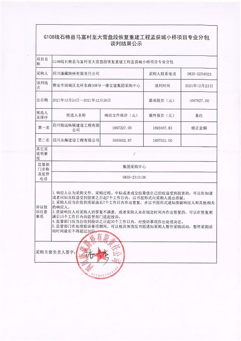四川康藏路橋有限責(zé)任公司G108線(xiàn)石棉縣馬富村至大營(yíng)盤(pán)段恢復(fù)重建工程孟獲城小橋項(xiàng)目專(zhuān)業(yè)分包談判結(jié)果公示