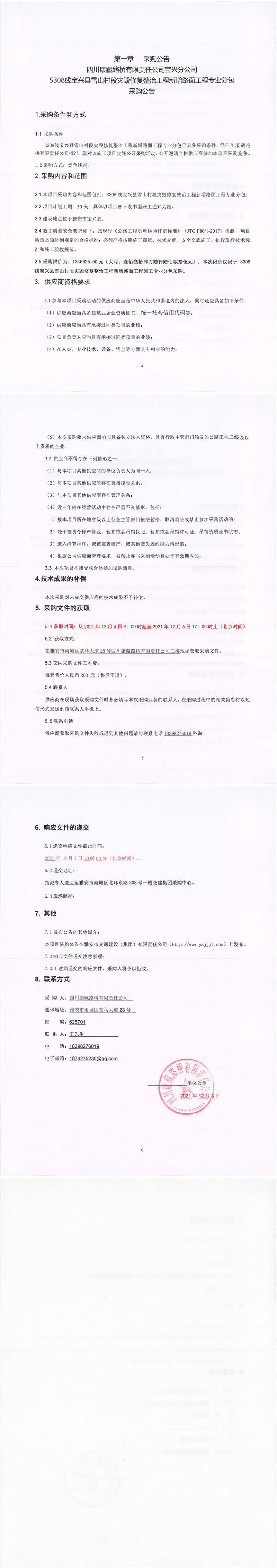 四川康藏路橋有限責(zé)任公司S308線寶興縣雪山村段災(zāi)毀修復(fù)整治工程新增路面工程施工專業(yè)分包采購公告
