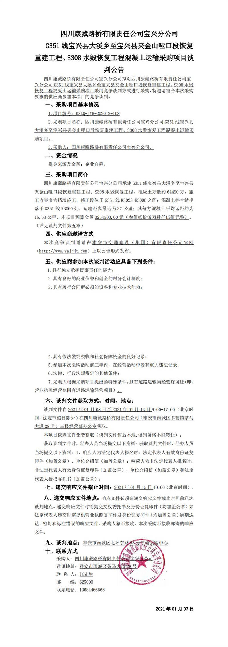四川康藏路橋有限責(zé)任公司寶興分公司G351線寶興縣大溪鄉(xiāng)至寶興縣夾金山啞口段恢復(fù)重建工程、S308水毀恢復(fù)工程混凝土運(yùn)輸采購項(xiàng)目談判公告