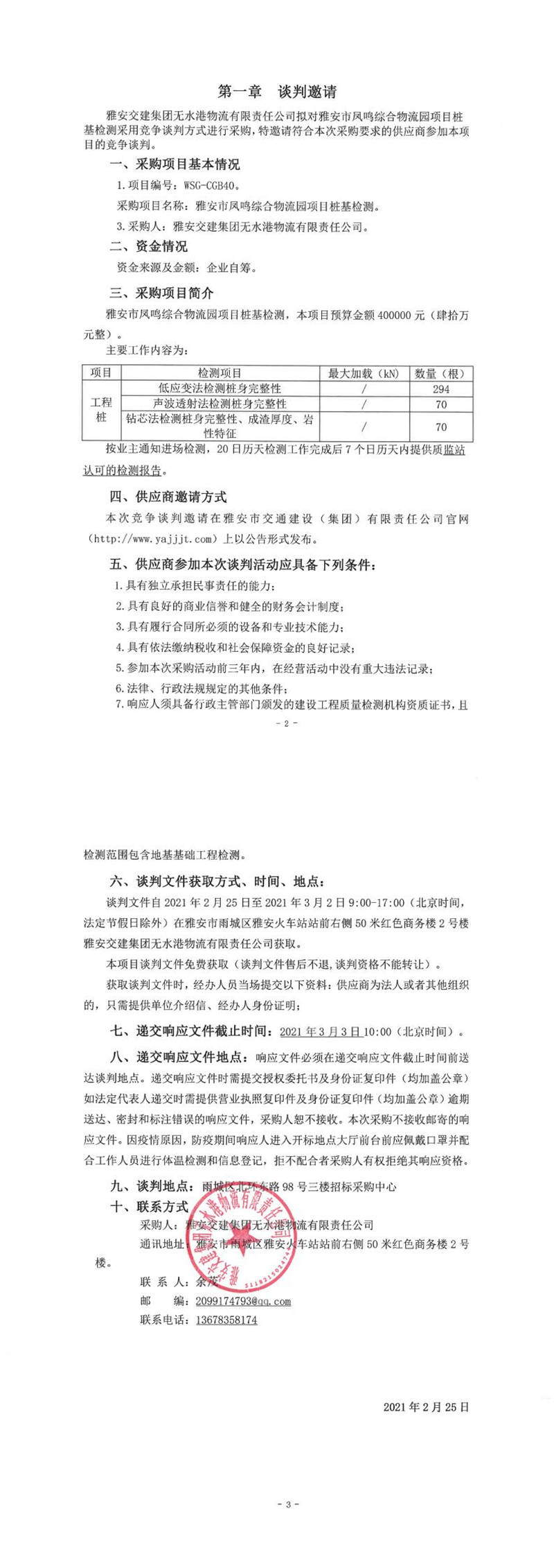 雅安交建集團(tuán)無水港物流有限責(zé)任公司雅安市鳳鳴綜合物流園項(xiàng)目樁基檢測(cè)競(jìng)爭(zhēng)談判公告