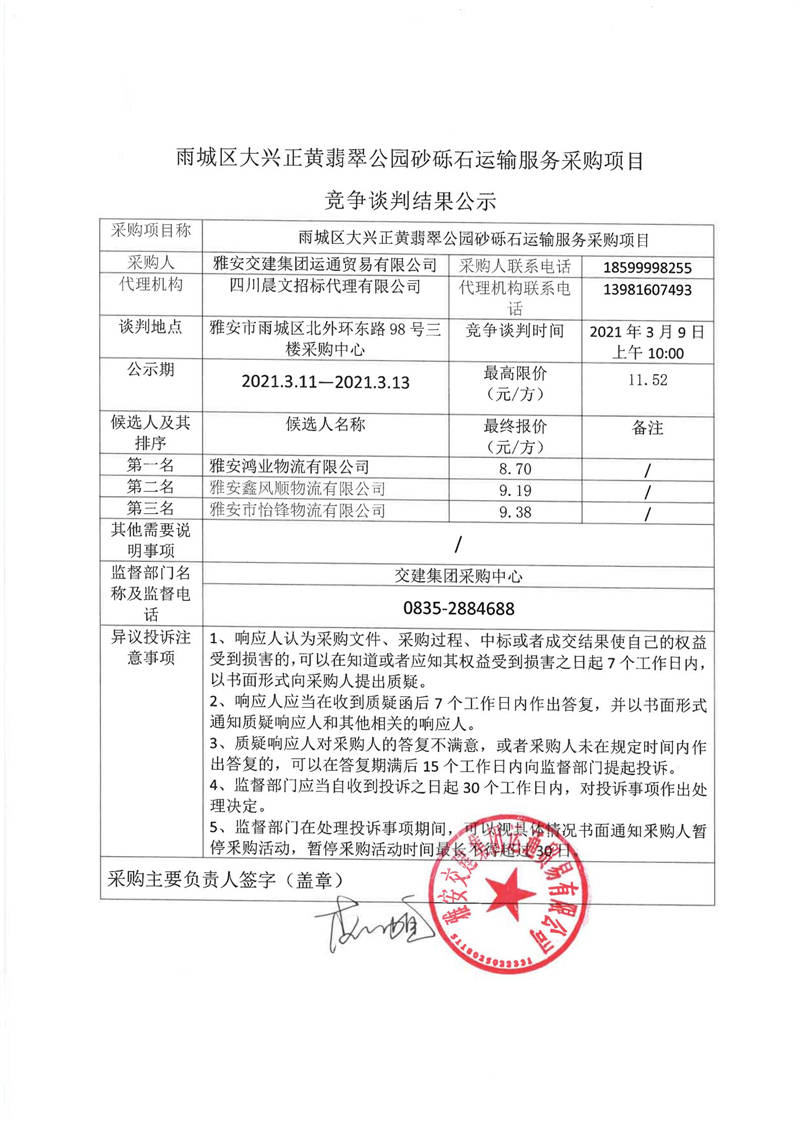 雅安交建集團運通貿(mào)易有限公司雨城區(qū)大興正黃翡翠公園砂礫石運輸服務(wù)采購項目競爭談判結(jié)果公示