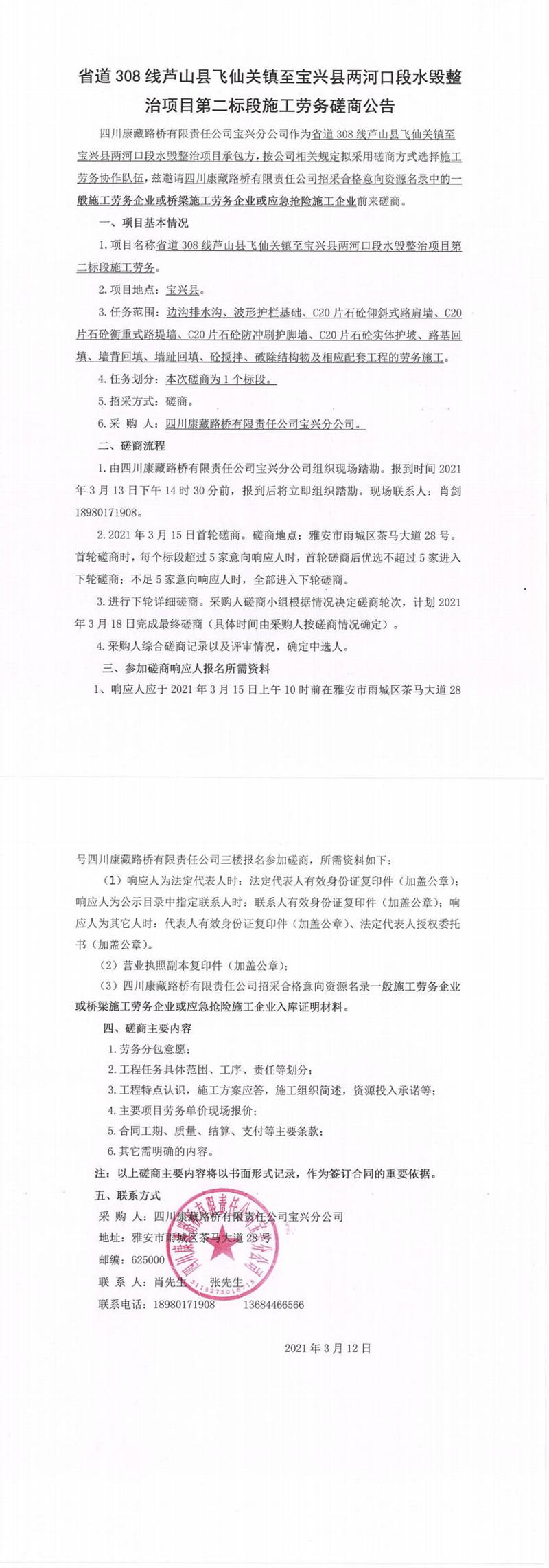 四川康藏路橋有限責任公司寶興分公司省道308線蘆山縣飛仙關鎮(zhèn)至寶興縣兩河口段水毀整治項目第二標段施工勞務磋商公告