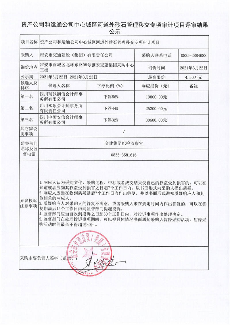 雅安市交通建設(shè)(集團)有限責(zé)任公司資產(chǎn)公司和運通公司中心城區(qū)河道外砂石管理移交專項審計項目評審結(jié)果公示