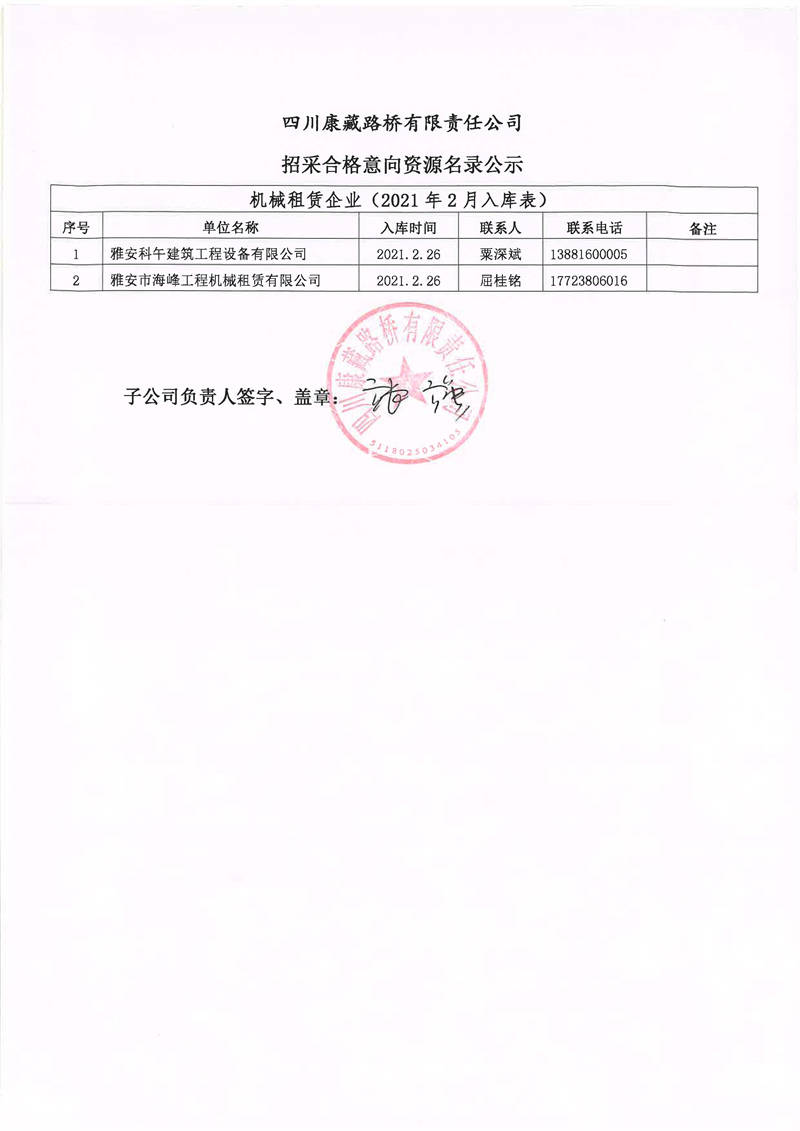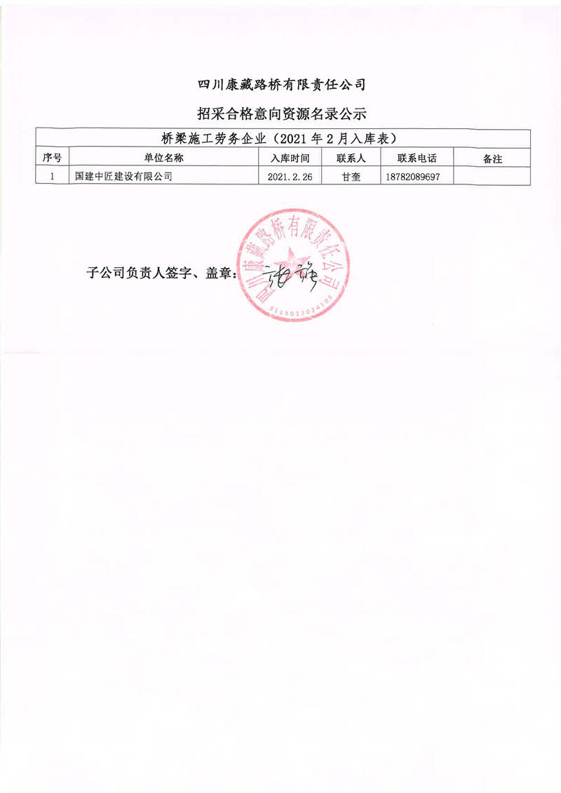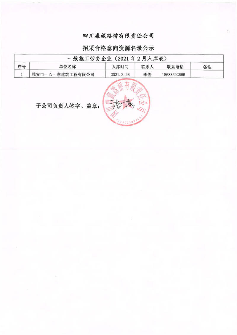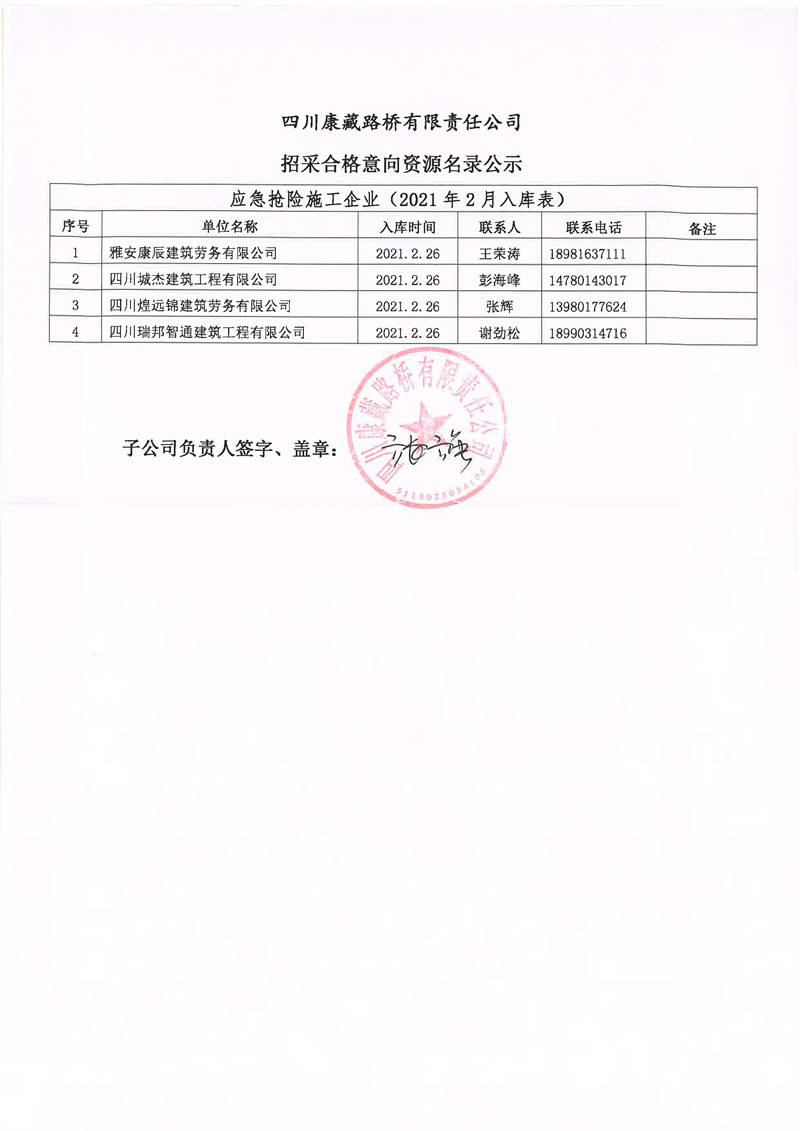 四川康藏路橋有限責(zé)任公司招采合格意向資源名錄補(bǔ)錄公示