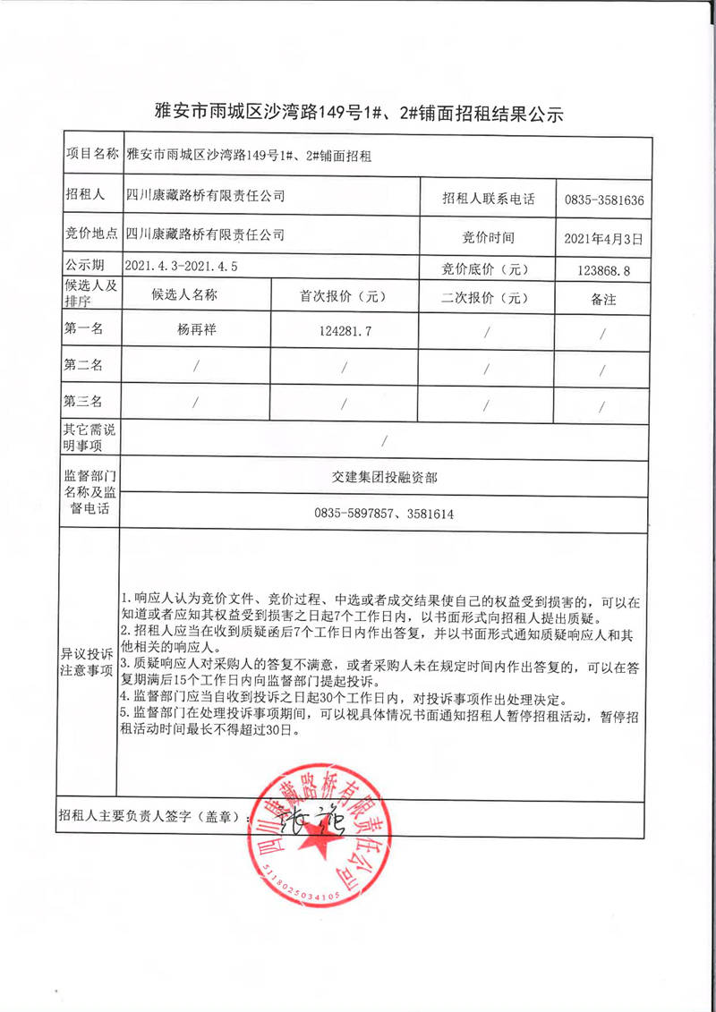 四川康藏路橋有限責(zé)任公司雅安市雨城區(qū)沙灣路149號1#、2#鋪面招租結(jié)果公示