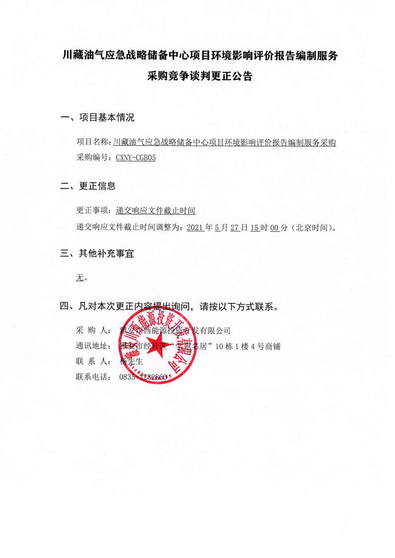 雅安川西能源投資開發(fā)有限公司川藏油氣應(yīng)急戰(zhàn)略儲備中心項(xiàng)目環(huán)境影響評價報告編制服務(wù)采購競爭談判更正公告