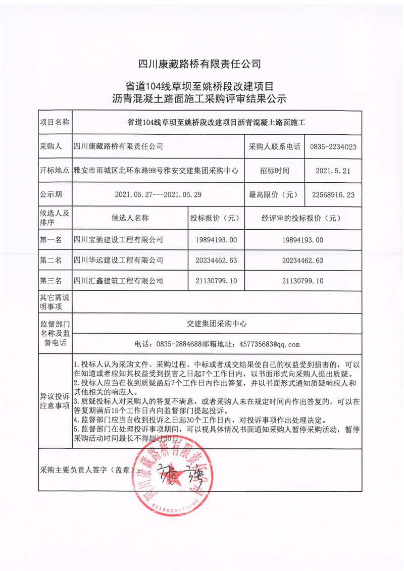四川康藏路橋有限責任公司省道104線草壩至姚橋改建項目瀝青混凝土路面施工采購評審結果公示