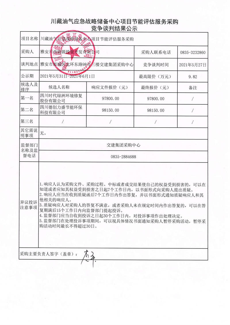 雅安川西能源投資開發(fā)有限公司川藏油氣應急戰(zhàn)略儲備中心項目節(jié)能評估服務采購競爭談判結果公示