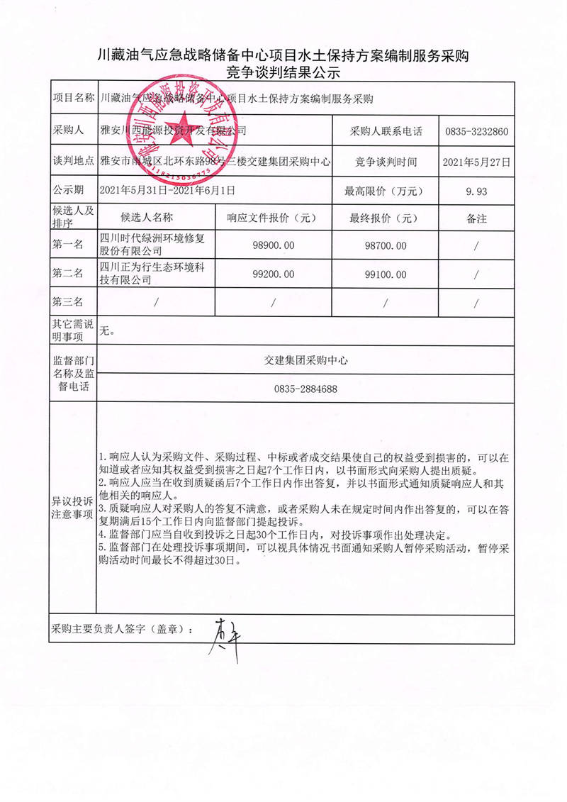 雅安川西能源投資開發(fā)有限公司川藏油氣應(yīng)急戰(zhàn)略儲備中心項(xiàng)目水土保持方案編制服務(wù)采購競爭談判結(jié)果公示