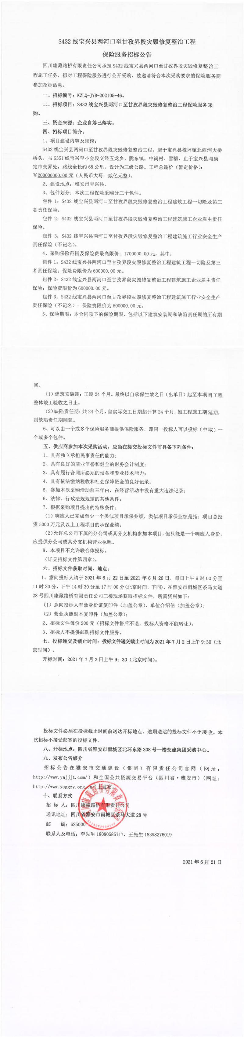 四川康藏路橋有限責任公司S432線寶興縣兩河口至甘孜界段災(zāi)毀修復整治工程保險服務(wù)招標公告