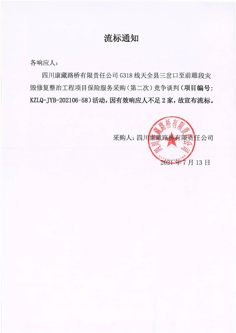 四川康藏路橋有限責(zé)任公司G318線天全縣三岔口至前雕段災(zāi)毀修復(fù)整治工程項(xiàng)目保險(xiǎn)服務(wù)采購(gòu)(第二次)流標(biāo)通知