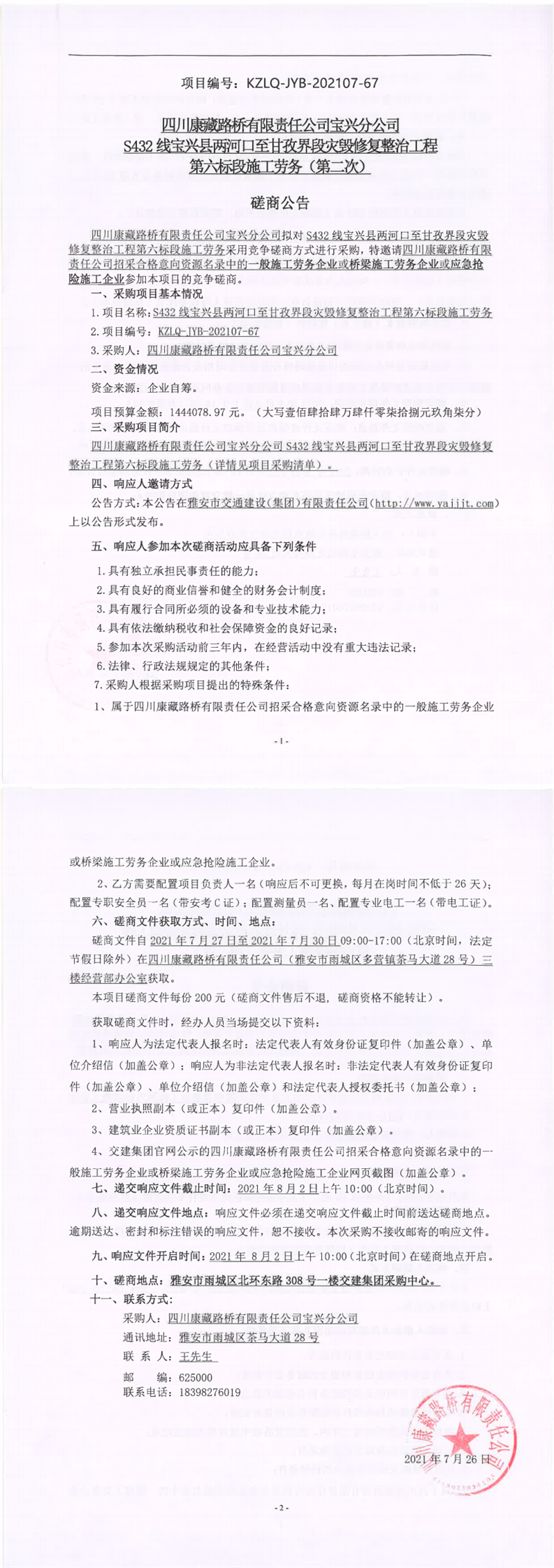 四川康藏路橋有限責(zé)任公司S432線寶興縣兩河口至甘孜界段災(zāi)毀修復(fù)整治工程第六標段施工勞務(wù)(第二次)競爭磋商公告