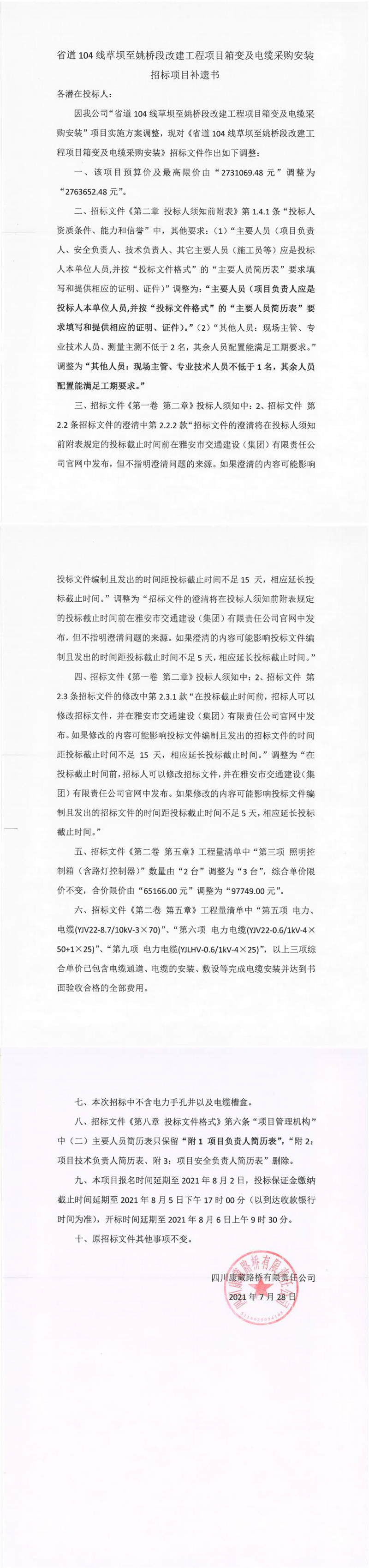 四川康藏路橋有限責(zé)任公司省道104線(xiàn)草壩至姚橋段改建項(xiàng)目箱變及電纜采購(gòu)安裝招標(biāo)項(xiàng)目補(bǔ)遺書(shū)
