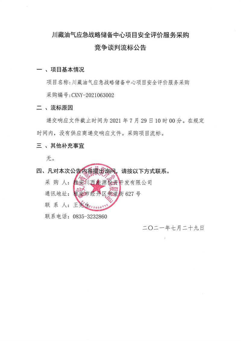 雅安川西能源投資開發(fā)有限公司川藏油氣應(yīng)急戰(zhàn)略儲(chǔ)備中心項(xiàng)目安全評(píng)價(jià)服務(wù)采購競爭談判流標(biāo)公告