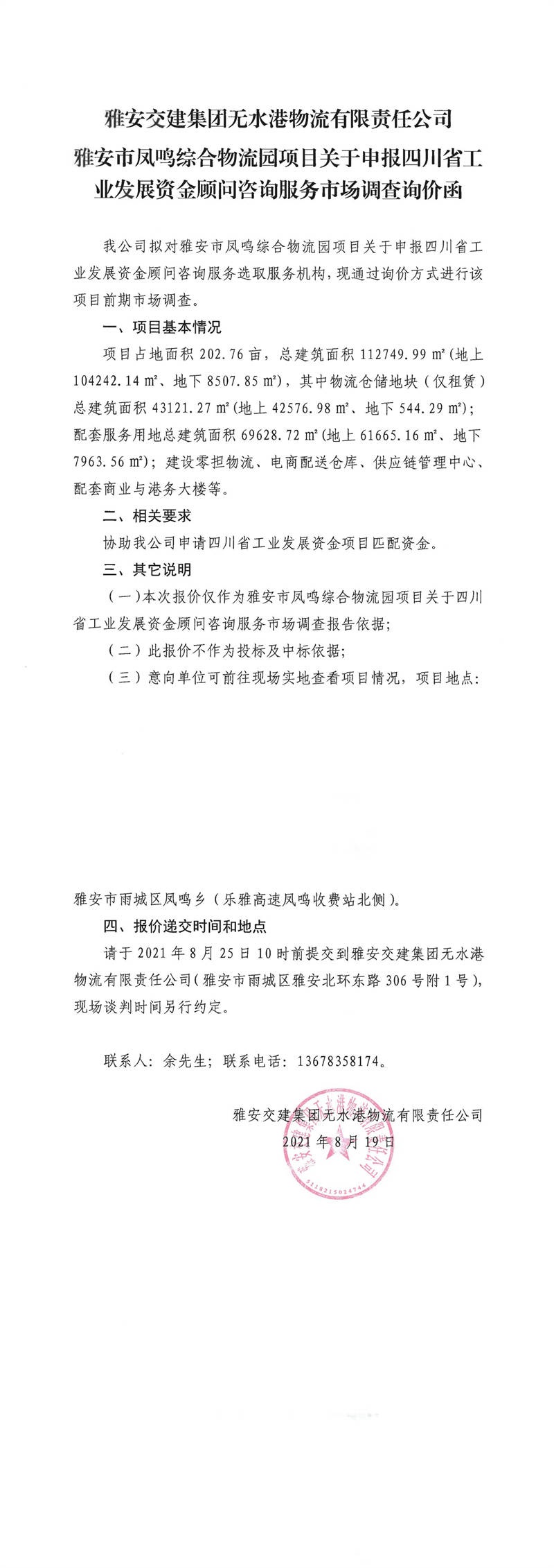 雅安交建集團無水港物流有限責任公司雅安市鳳鳴綜合物流園項目關于申報四川省工業(yè)發(fā)展資金顧問咨詢服務市場調查詢價函