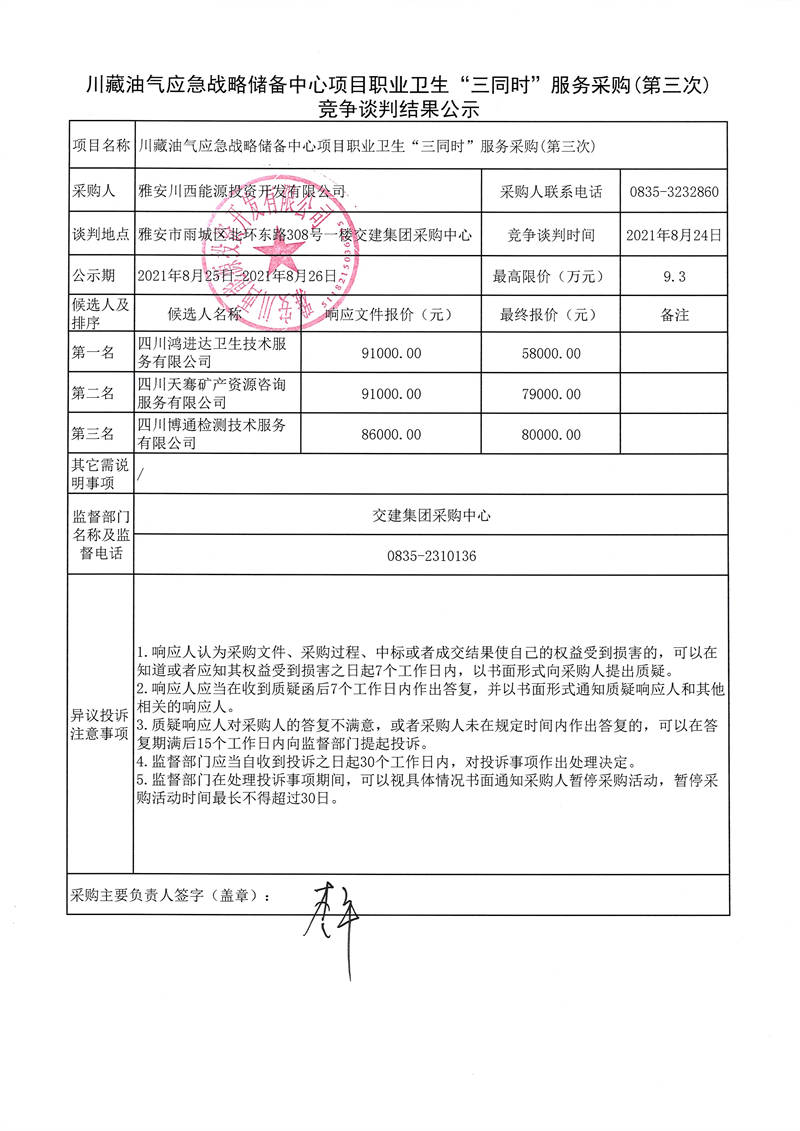 雅安川西能源投資開發(fā)有限公司川藏油氣應(yīng)急戰(zhàn)略儲(chǔ)備中心項(xiàng)目職業(yè)衛(wèi)生“三同時(shí)”服務(wù)采購(gòu)(第三次)競(jìng)爭(zhēng)談判結(jié)果公示