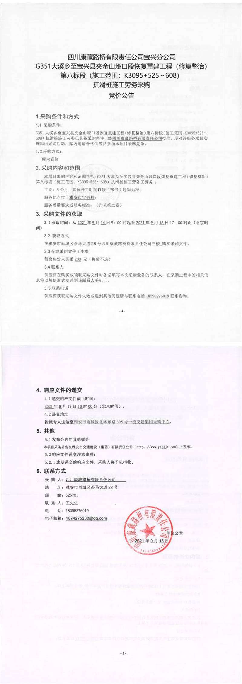 四川康藏路橋有限責任公司寶興分公司G351大溪鄉(xiāng)至寶興縣夾金山埡口段恢復重建工程(修復整治)第八標段(施工范圍:K3095+525-608)抗滑樁施工勞務采購競價公告
