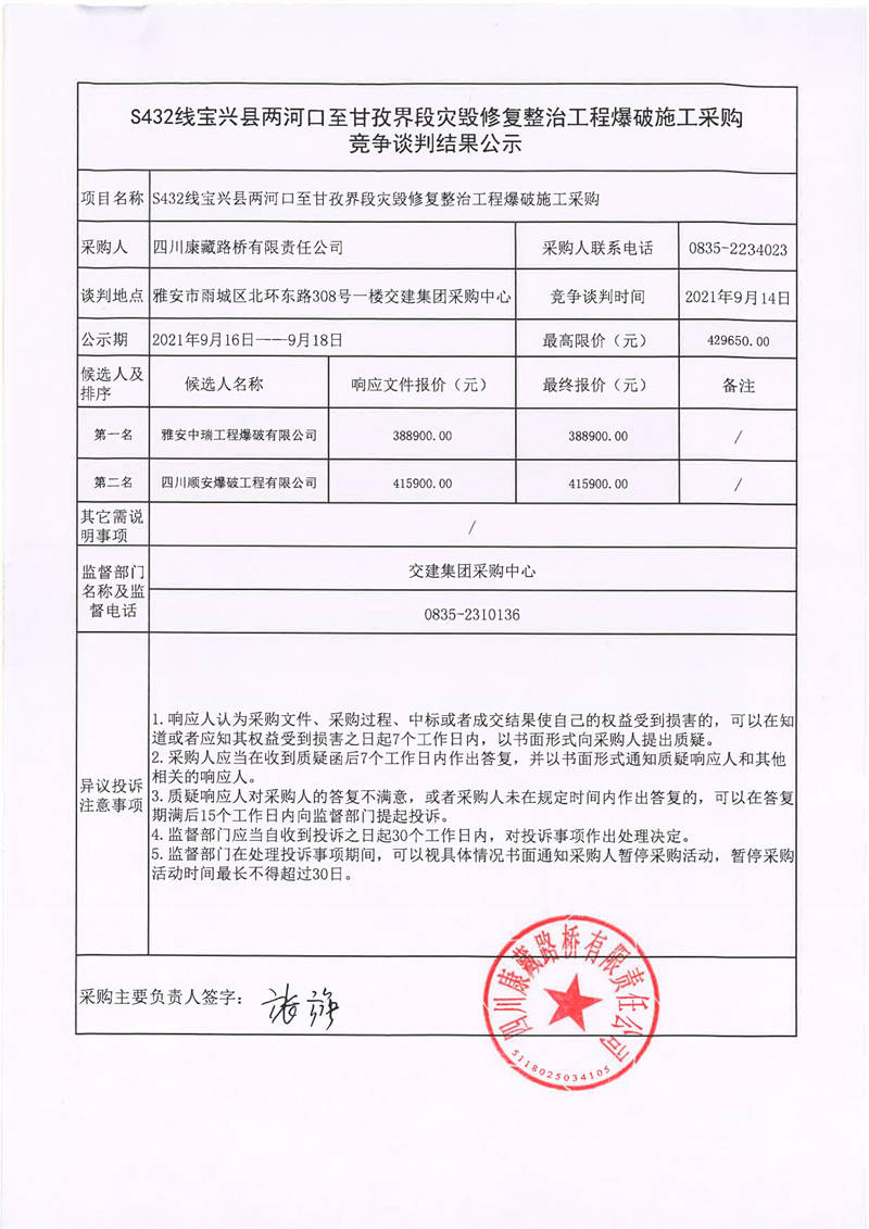 四川康藏路橋有限責(zé)任公司S432線寶興縣兩河口至甘孜界段災(zāi)毀修復(fù)整治工程爆破施工采購(gòu)競(jìng)爭(zhēng)談判結(jié)果公示