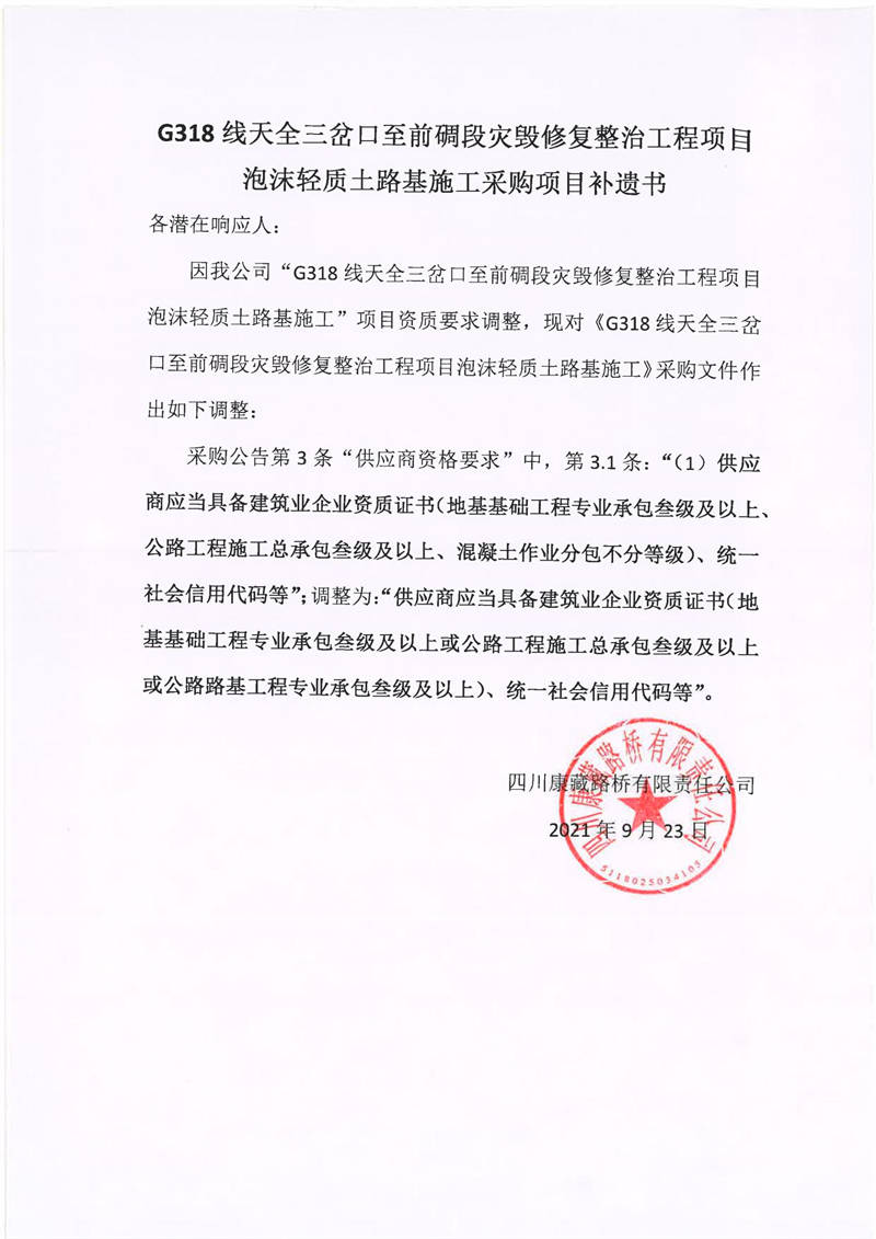 四川康藏路橋有限責(zé)任公司G318線天全三岔口至前碉段災(zāi)毀修復(fù)整治工程項(xiàng)目泡沫輕質(zhì)土路基施工采購(gòu)項(xiàng)目補(bǔ)遺書