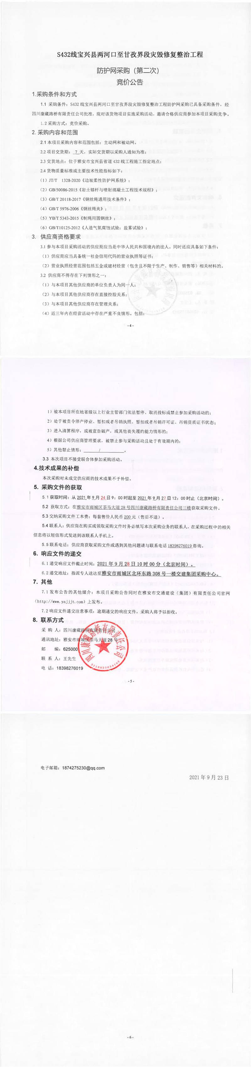 四川康藏路橋有限責(zé)任公司S432線寶興縣兩河口至甘孜界段災(zāi)毀修復(fù)整治工程防護(hù)網(wǎng)采購(第二次)競價(jià)公告